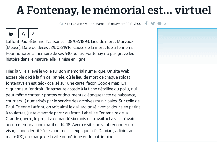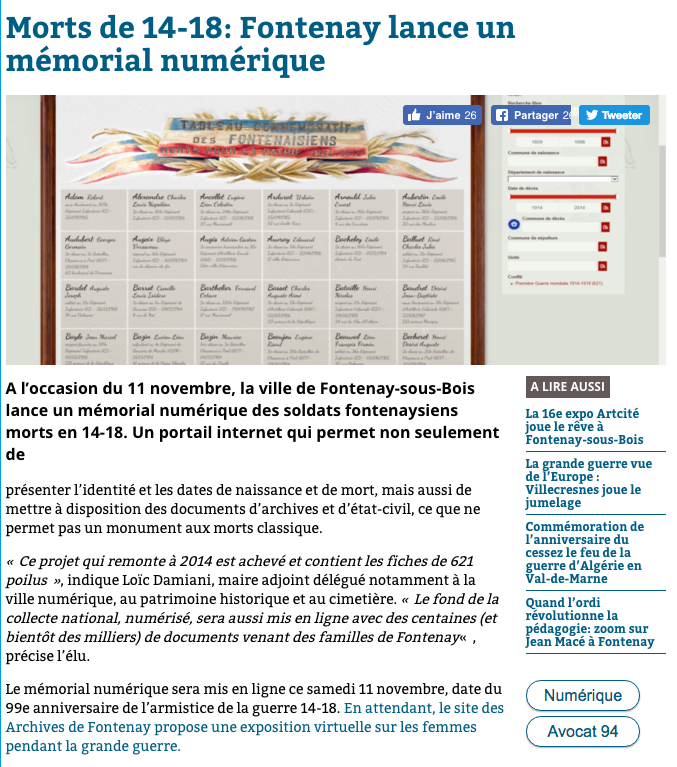 Aujourd'hui ce mémorial numérique, consultable en ligne sur le portail de valorisation des Archives municipales de Fontenay-sous-Bois, donne accès aux identités et aux vies des centaines d'habitants morts de cette guerre.