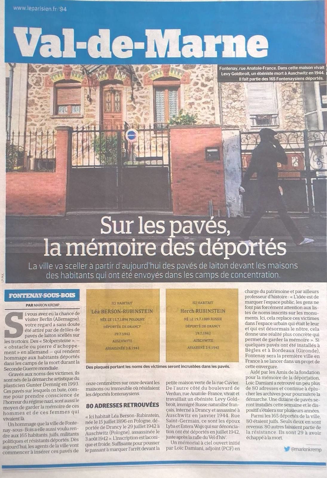 Dans la suite du travail que j'ai eu l'honneur de mener avec la Fondation pour la Mémoire de la Déportation du Val-de-Marne, une initiative a eu lieu à Fontenay-sous-Bois à propos de l'histoire des déporté-e-s de la commune.