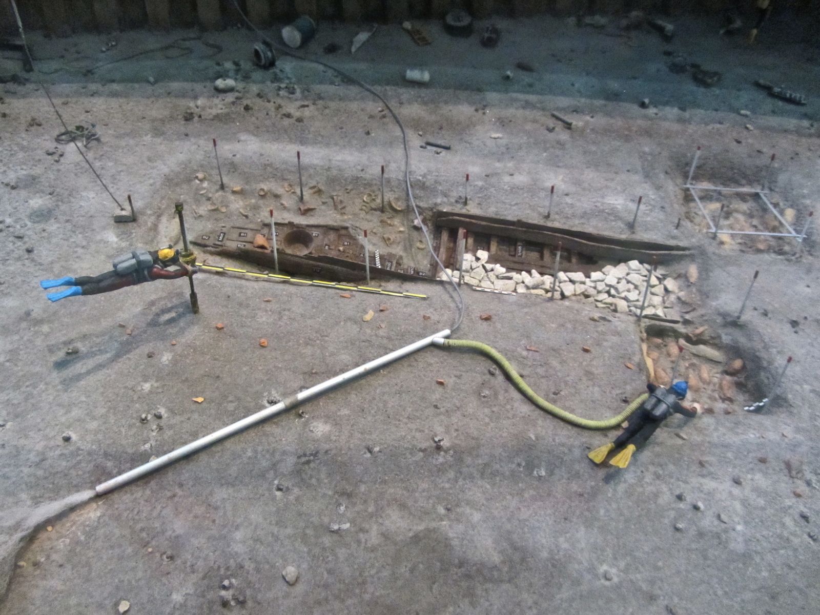 Les fouilles sous-marines que représente cette maquette du Musée départemental d'archéologie d'Arles ont permis de découvrir dès 2004 une barge romaine.